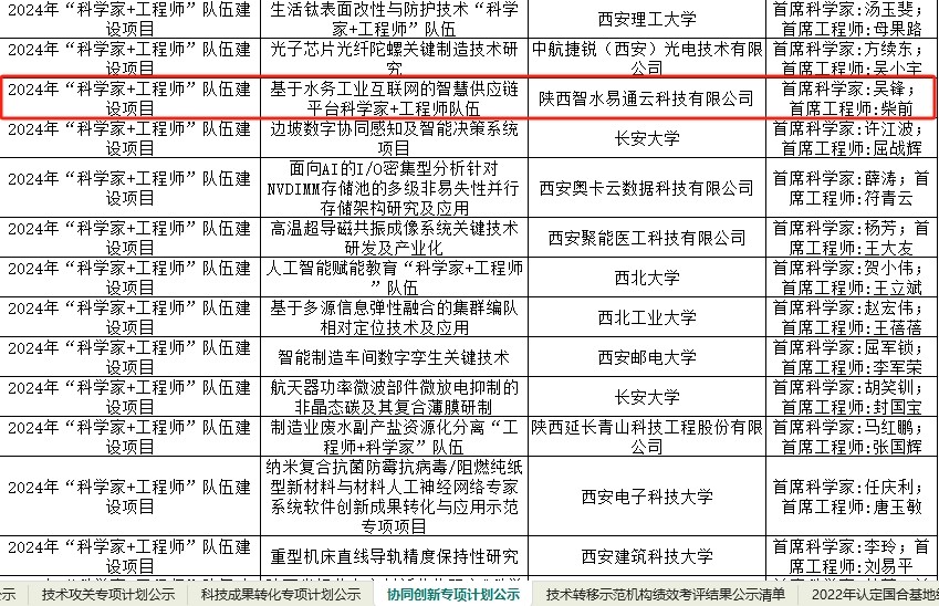 近日,西安市科技局公示了2024年度第一批科技计划项目拟立项目,由陕西智水易通云科技有限公司与西安交通大学联合申报的“基于水务工业互联网的智慧供应链平台‘科学家+工程师’队伍”入选西安市“科学家+工程师”队伍名单。